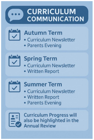 You will also be invited to attend Parents’ Evenings in the Autumn and Summer Terms, where you’ll have the opportunity to speak with staff about your child’s progress, strengths, and next steps. In Spring and Summer, you will receive a written report covering both academic progress and EHCP outcomes.
